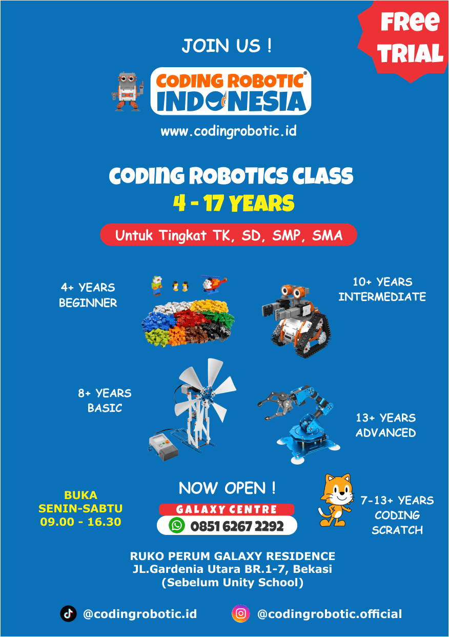 KEGIATAN TRAINING CENTRE CODING ROBOTIC INDONESIA MULAI DARI USIA 4 TAHUN SAMPAI DENGAN 18 TAHUN DAPAT DILAKUKAN DI CENTRE TERDEKAT, DENGAN MAKSIMAL PESERTA 5 ORANG DALAM SATU KELAS YANG DIBIMBING OLEH TENAGA PENGAJAR KAMI YANG TERLATIH DAN PROFESIONAL.